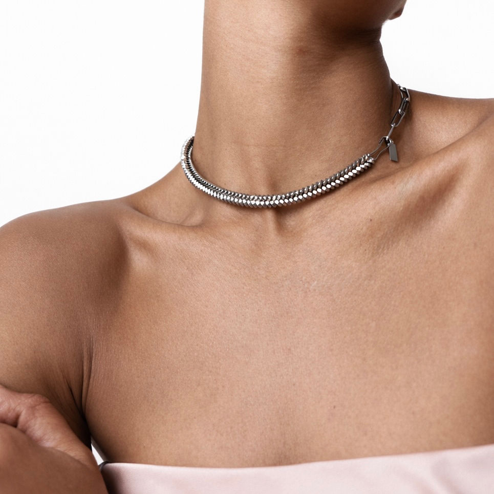 JEDE KETTE ENTWICKELT EINE LINEARE STRUKTUR ENTLANG DES KÖRPERS – EIN SPIEL AUS VERBINDUNG, RHYTHMUS UND BEWEGUNG. ZWISCHEN HÄRTE UND WEICHHEIT ENTSTEHT EINE RUHIGE BALANCE, DIE SICH MIT DEM KÖRPER VERÄNDERT.
